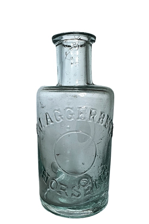 I galleriet nedenfor ses en lille flaske fra fabrikken og i to lodrette linjer læses på flasken, C.J. AGGERBECK HORSENS. Flasken, som har været anvendt som parfumeflaske, er ca. 50 mm høj med rummålet ca. 10 ml.