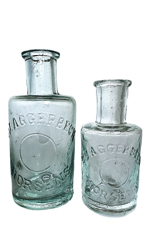 I galleriet nedenfor ses flasker med cirkulære tværsnit som har været benyttet til brillantine. Flaskerne rummer hhv. ca. 30 og 75 ml og har højde på hhv. ca. 75 og 93 mm. På flaskerne ses teksten C.J. AGGERBECK HORSENS.
