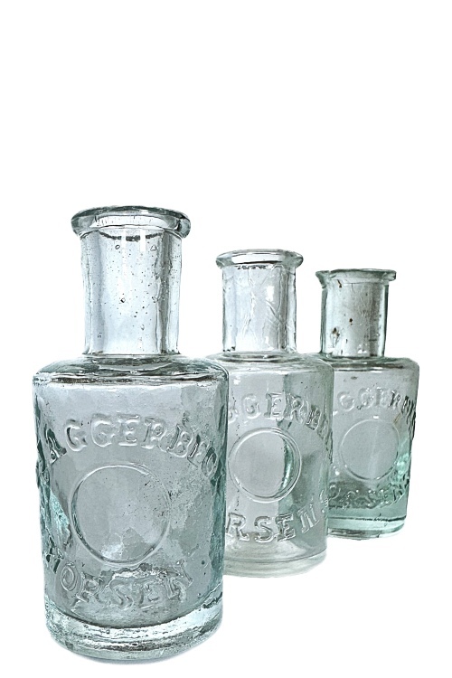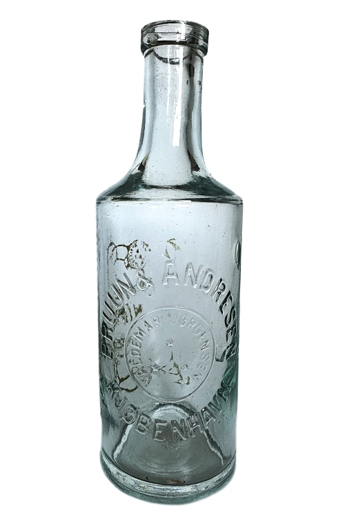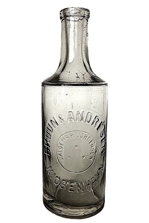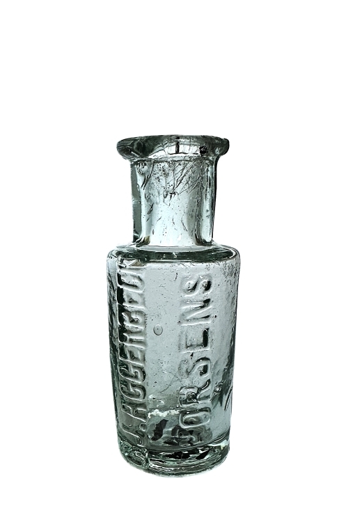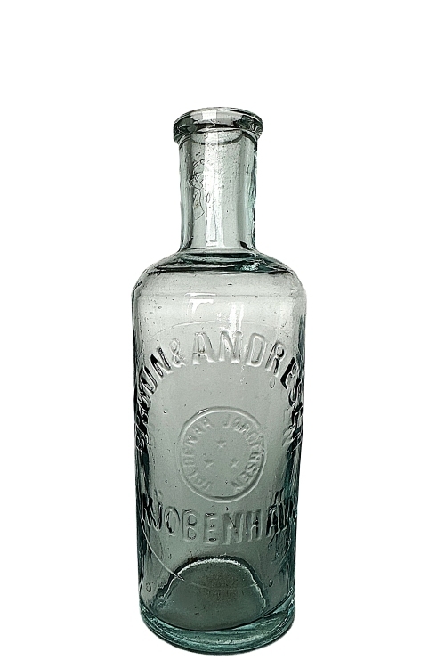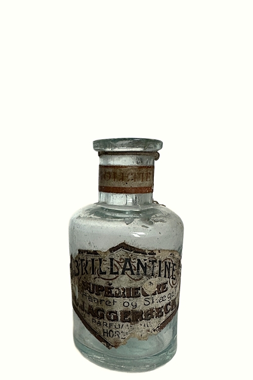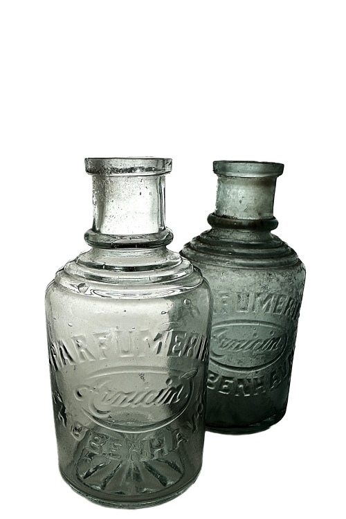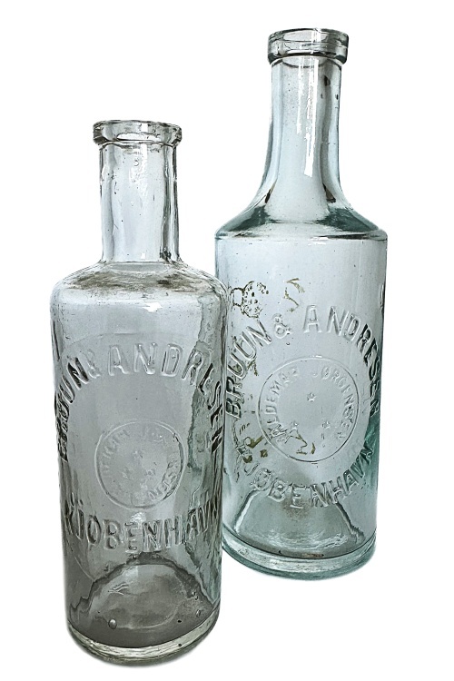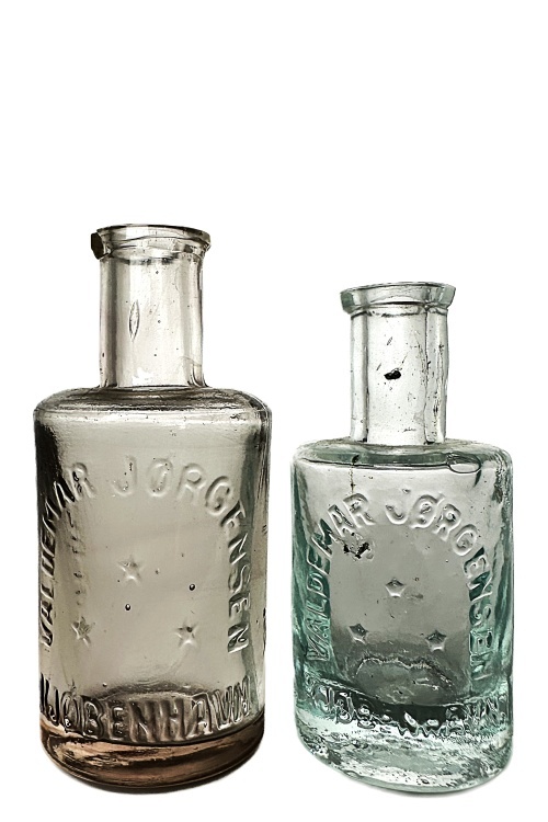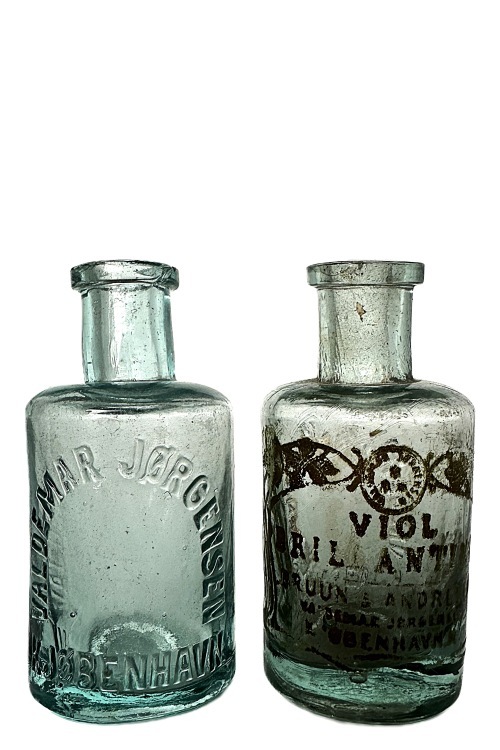 I galleriet nedenfor ses flasker med cirkulære tværsnit som har været benyttet til brillantine og evt. hårvand. De mindre flasker har højden ca. 140 mm og rummer ca. 200 ml mens de større flasker har et rummål på ca. 400 ml og en højde på 175 ml. Teksten på flaskerne stort set identiske, bortset fra at København staves med hhv. I og J. Flaskerne har været anvendt i perioden omkring år 1900 – 1930.