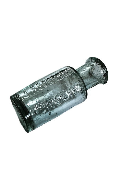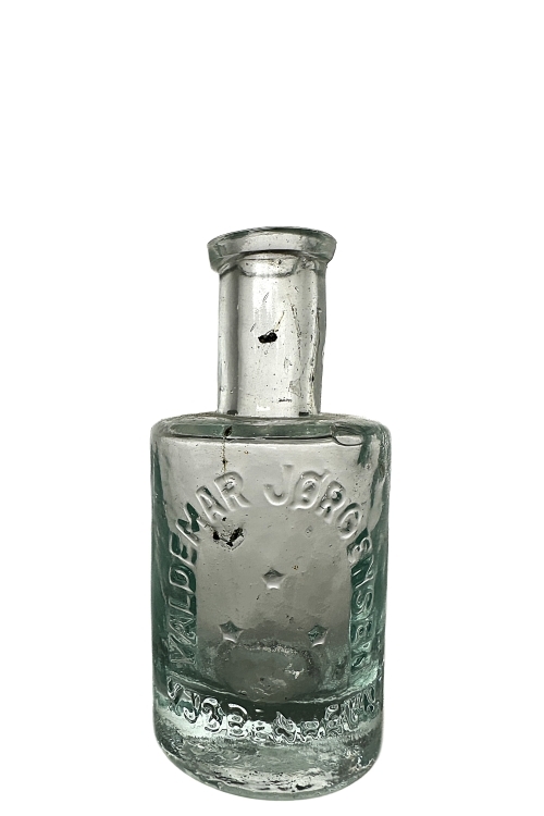 I galleriet ses en gullig flaske med den prægede tekst J. FREDERIKSENS FABRIK lodret på flasken. Denne langhalsede, ottekantede flaske, findes i forskellige farvenuancer, fra den lyst gullige til mere mørkt brun/røde farver. J. FREDERIKSENS FABRIK var beliggende i KØBENHAVN og fabrikken producerede bl.a. hårprodukter. Jeg vil tro, at denne flaske har indeholdt hår-elixir – der kendes gamle annoncer hvor der reklameredes med sådanne hårprodukter fra J. Frederiksens Fabrik. En sådan hår-elixir har bl.a. fundet anvendelse mod skæl, kløe, hovedsmerter, tyndt hår, spaltet hår, ja endog gråt hår – Sikke en elixir!
