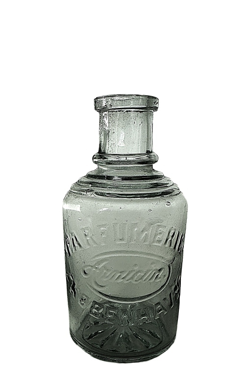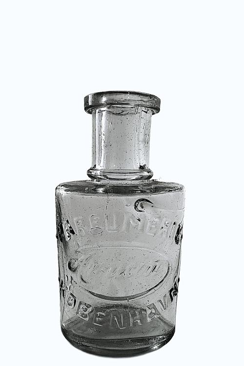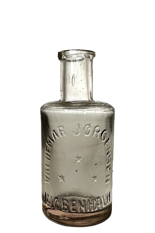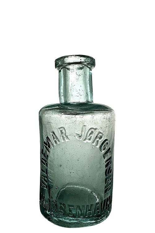 I galleriet ses en klar flaske anvendt til KÖLNERVAND – den danske oversættelse af EAU DE COLOGNE. Af flaskens velbevarede etikette fremgår, at denne kölnervand er produceret på VIBE-HASTRUPs KEMISKE FABRIKER i KØBENHAVN, en virksomhed som i øvrigt fremstillede mange forskellige kemiske og tekniske produkter. Flasketypen findes i mindst fem forskellige størrelser, og af listefortegnelse fra Holmegaards Katalog fra 1909, fremgår disse flasketyper under betegnelsen Maria Farina. Allerede i 1709 flyttede italieneren Giovanni Maria Farina til Köln i Tyskland, hvor han opstartede salg af parfumer. Den oprindelige parfume, som fik betegnelsen Kölnervand er i dag verdenskendt. I øvrigt produceres stadig den originale Eau de Cologne i regi af Farina-familien, selvom der findes utallige andre producenter af parfumer under samme navn – Eau de Cologne. Se i øvrigt yderligere om Kölnervand længere nede i dette galleri under Kölnervand – Alfred Benzon.