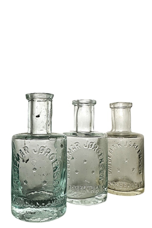 I galleriet nedenfor ses forskellige små-flasker som er anvendt til både parfume og brillantine. Kendetegnende for sådanne flasker er, at det oftest er 5 – 10 cm høje flasker som er lavet i klart glas. I galleriet ses fx flasker fra C. RAFN´S FABRIKKER samt VALDEMAR JØRGENSEN KJØBENHAVN.